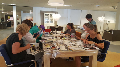 Een workshop collage maken duurt 2,5 uur.– In deze tijd leert u een eenvoudige collage te maken., zoals bijv. een vlinder of pump. Alle materialen (canvasdoek 18×24 of 20×20 cm, tijdschriften, lijm etc.) zijn aanwezig. Misschien hebt u iets wat speciaal voor u is, zoals bijv. een foto, een tekst of afbeelding uit een tijdschrift of krant, die bij u past, uw favoriete tijdschrift etc. Wanneer u dit meeneemt kunt u het gebruiken in uw collage en er zo een persoonlijk verhaal van maken. U kunt ook een masterclass volgen, wat bestaat uit 4 lessen.